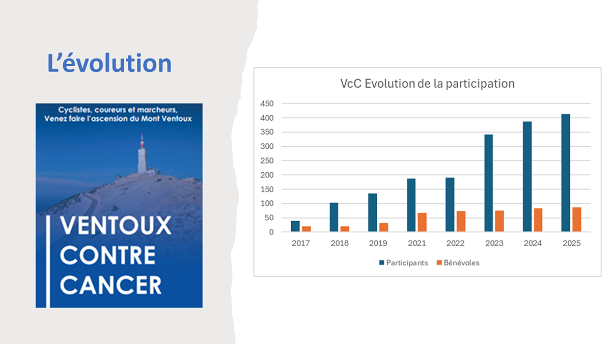 L'association Ventoux contre Cancer, loi 1901, est née en 2017 d'un constat déchirant : chacun d'entre nous est, de près ou de loin, touché par le cancer.